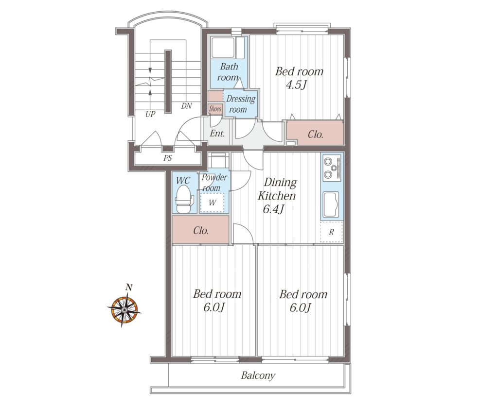 DK 6.4畳 洋室 4.5畳 洋室 6.0畳 洋室 6.0畳 |