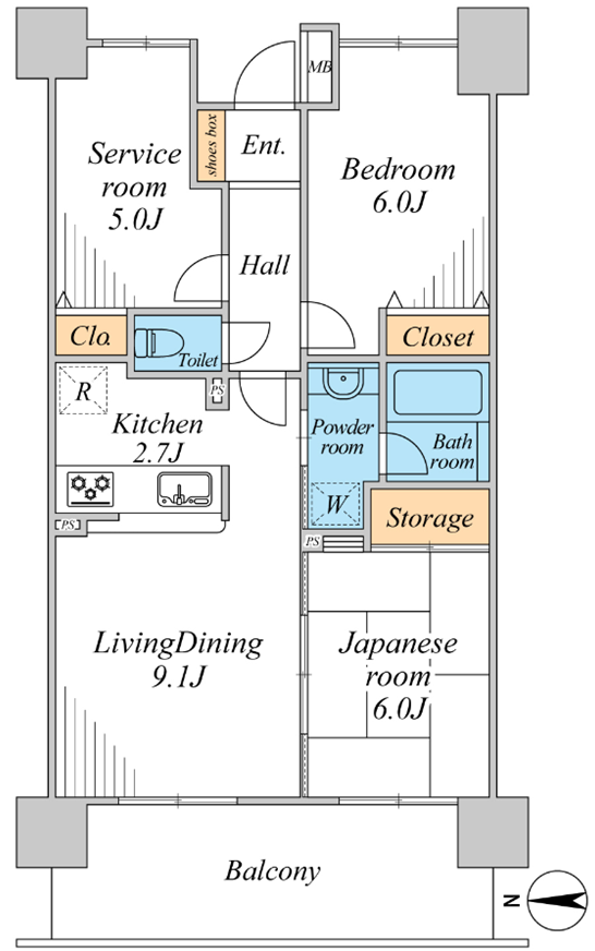 リビングダイニング、和室、洋室、サービスルーム |