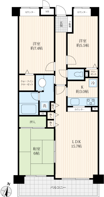 洋室 5.5畳 洋室 7.4畳 LDK 15.7畳 和室 6畳 |